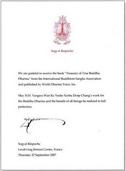 著名的《西藏生死書》的作者索甲仁波且看到《正法寶典》後,非常感動,寫祝賀信恭祝第三世多杰羌佛的弘法利生事業達到最圓滿。