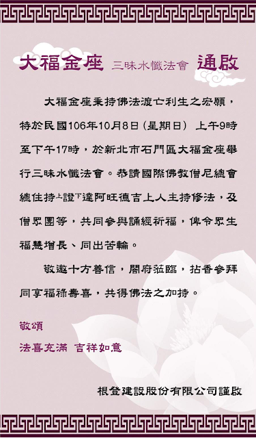 大福金座秉持佛法渡亡利生之宏願,特於民國106年10月8日(星期日)上午9時至下午17時,於新北市石門區大福金座舉行三昧水懺法會。恭請國際佛教僧尼總會總住持上證下達阿旺德吉上人主持修法,及僧眾團等,共同參與誦經祈福,俾令眾生福慧增長、同出苦輪。